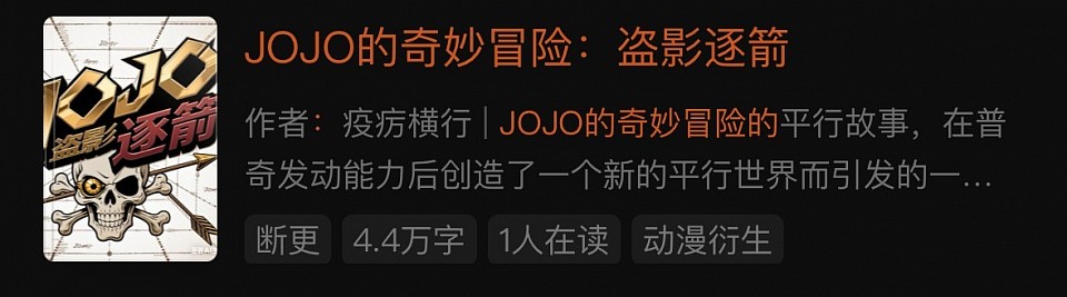 我们已将社群共创的剧情,打磨成官方小说《JOJO的奇妙冒险:盗影逐箭》,并发布于番茄小说平台。小说延续JOJO系列的“黄金精神”与“规则系战斗”内核,把社群里的替身设定、对战名场面、原创角色故事,转化为连贯的文字冒险,让你既能在社群里参与剧情,也能在小说里重温或补全所有精彩情节。